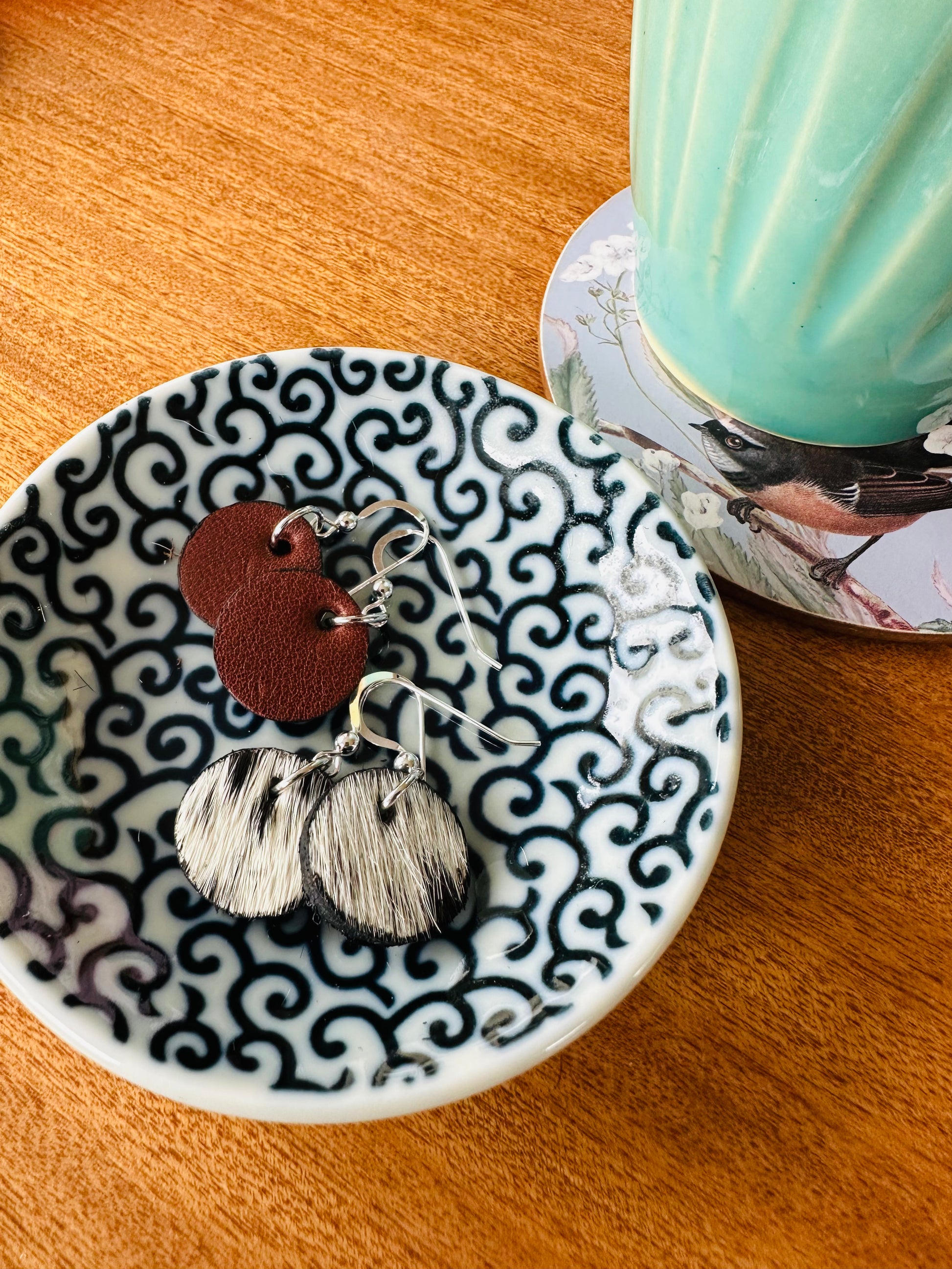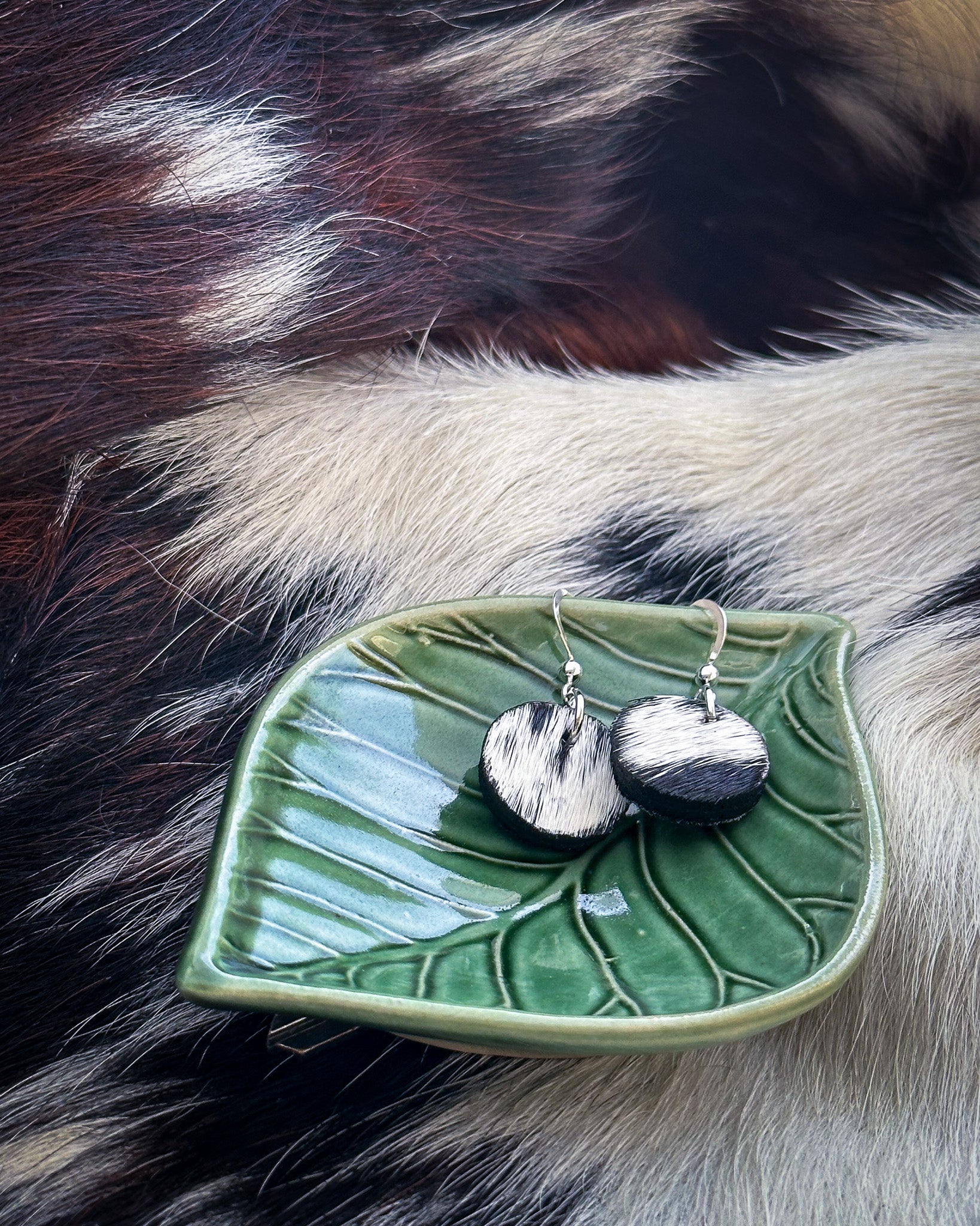 The nature of cowhide being what it is, means the earrings you get may look a little different to the ones photographed. And each earring will look different to the other, with two sides of hide to show off. Some may be more white than black or brown. If you have a preference, please add a message at checkout.