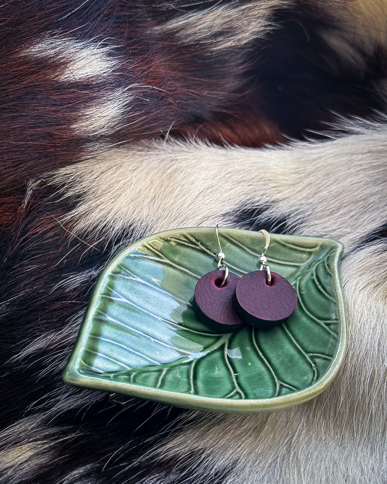 Be cute and stylish with these dainty Leather Earrings. Crafted with 2 cm discs of leather or cowhide with black painted edges and sterling silver hooks, they're just the perfect size to show off your awesome sense of style, at a 4 cm drop, they won't weigh you down! Show the world what you're made of!