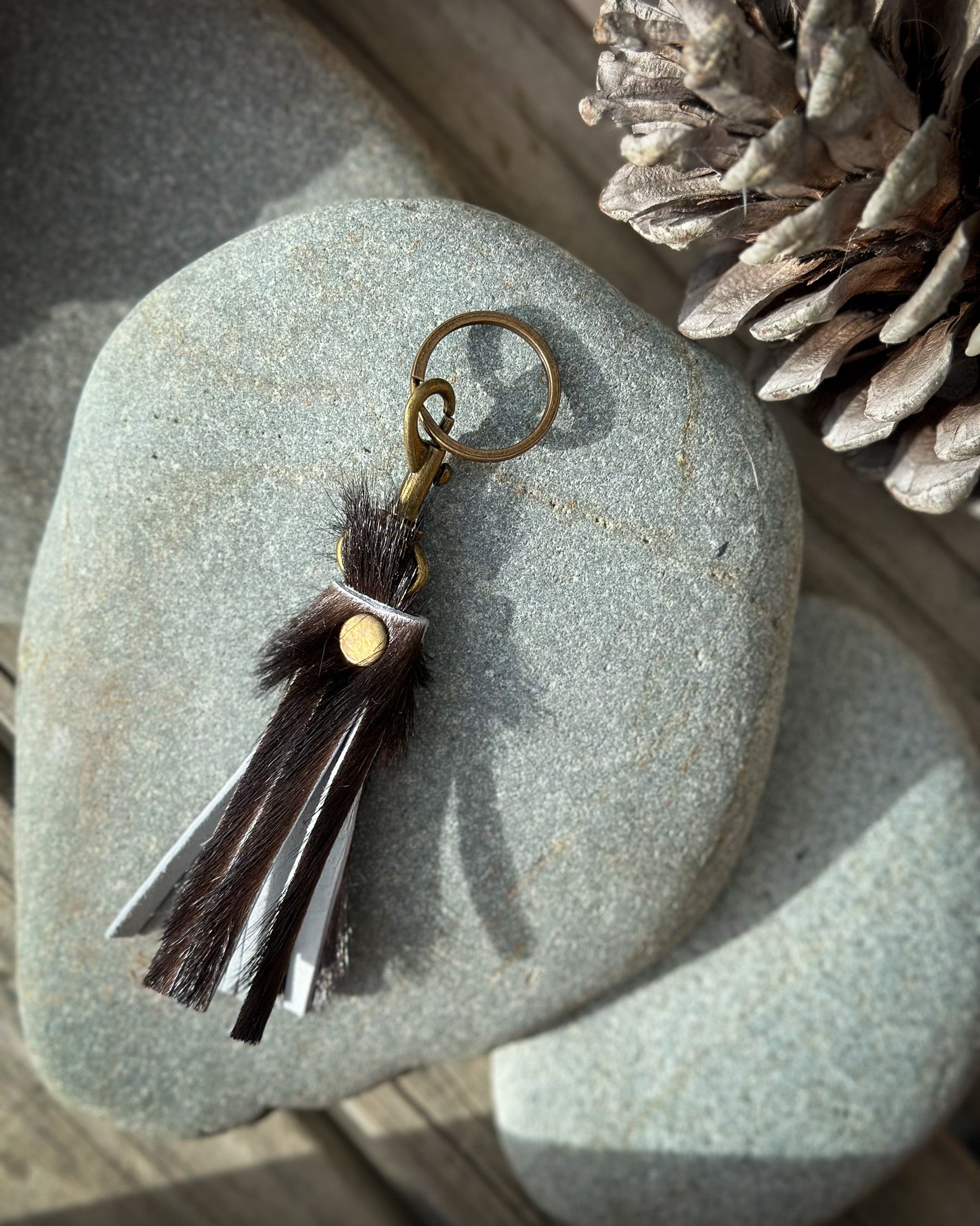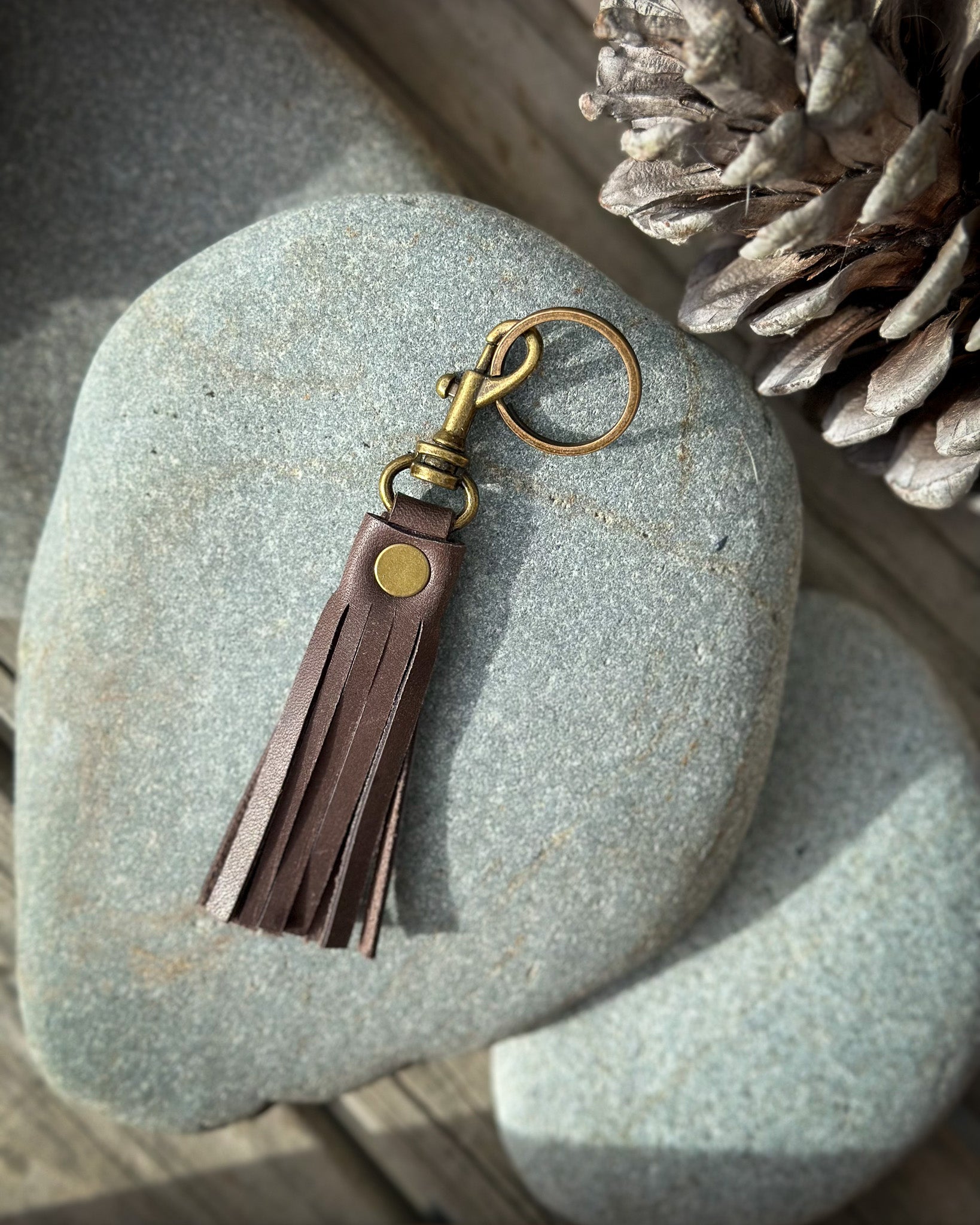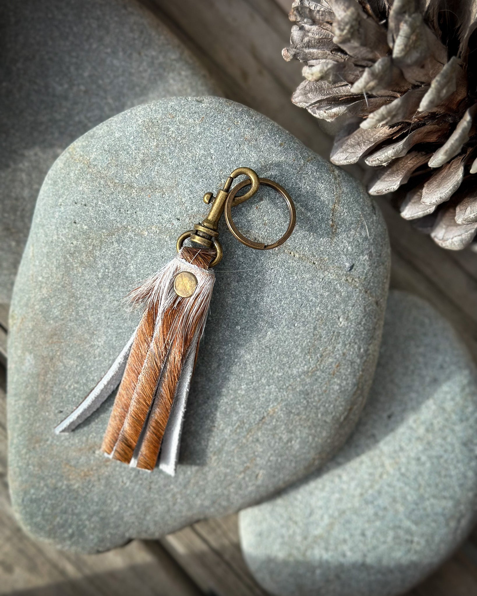 A handmade leather (or cowhide) tassel to use as a key fob or to decorate your handbag. Choose from silver nickel or antique bronze hook and key ring, then choose which colour of leather or cowhide, pop it in your cart, and you're away!